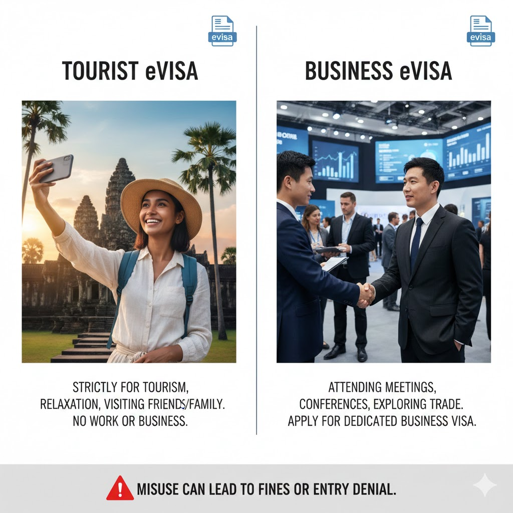 - Tourist eVisa: Strictly for tourism, relaxation, and visiting friends/family. You cannot work or conduct official business on this visa.