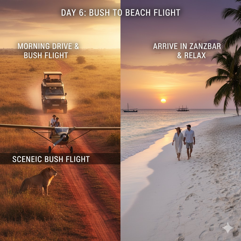 - Description: After a final safari breakfast, your guide will drive you to the nearest airstrip for your "bush flight" to Zanzibar.