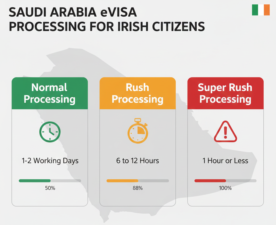 Saudi Arabia eVisa processing time for Ireland citizens varies with the chosen processing option: Normal, Rush, or Super Rush. The summary of the processing time for each option is as follow: