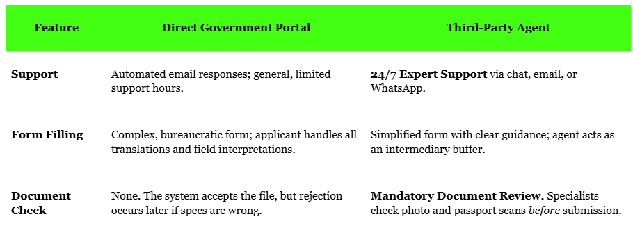 The final visa document is identical, but the application journey is completely different. The government site operates as a self-service platform, while the agent provides human-guided assistance: