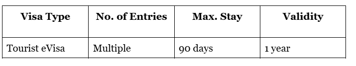 The eVisa allows stays of up to 90 days per entry within its 1-year validity period.