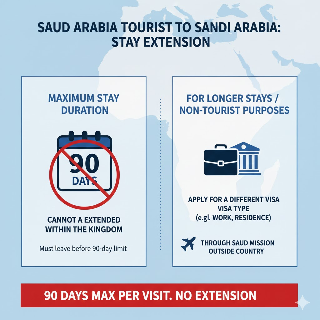 If you need to remain in Saudi Arabia for a period longer than 90 days, you must leave the country before the 90-day limit is reached. For long-term residency or non-tourist purposes, you must apply for a different type of visa (e.g., residence or work) through the appropriate Saudi mission outside of the country.