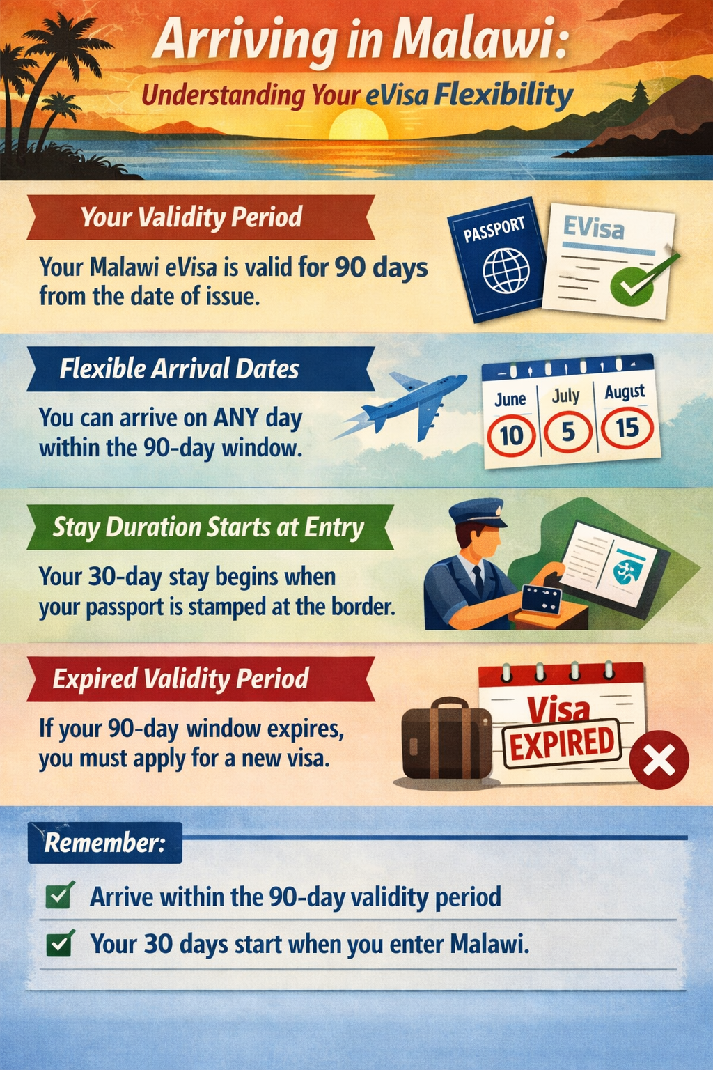 Your Malawi eVisa comes with a "Validity Period," which is the window of time during which you are allowed to enter the country (usually 90 days from the date of issue).