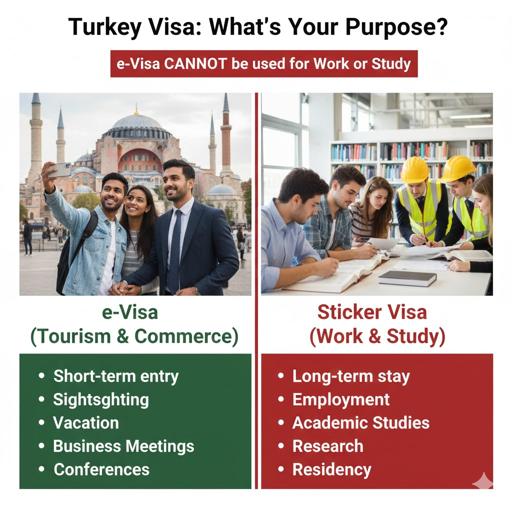 If your intention is to work, study, conduct long-term research, or seek residence in Türkiye, you must apply for the appropriate Sticker Visa (Work Visa or Student Visa) through the nearest Turkish Embassy or Consulate before traveling. The e-Visa cannot be converted or used for these long-term purposes.