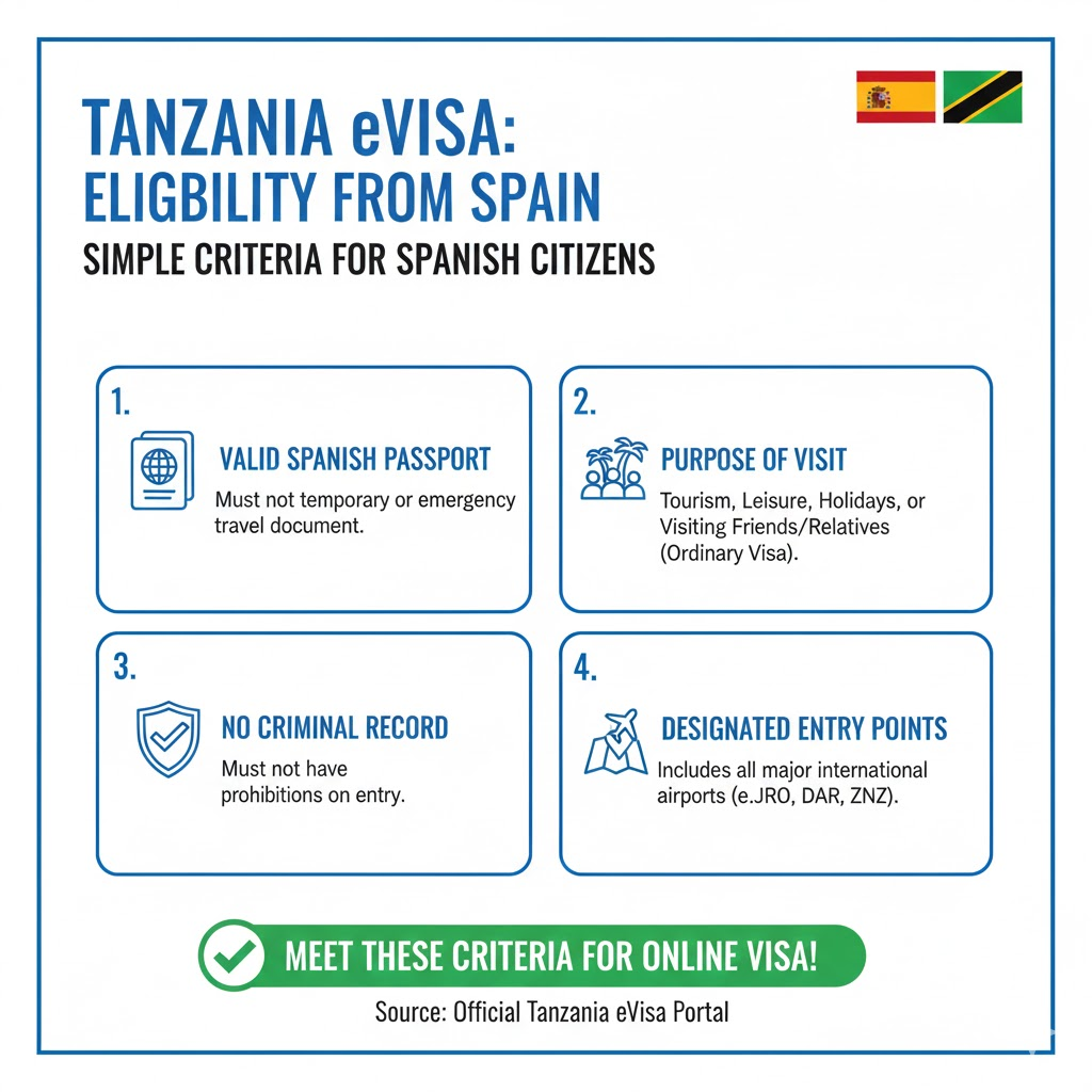 What are the eligibility requirements for a Tanzanian eVisa when applying from Spain?