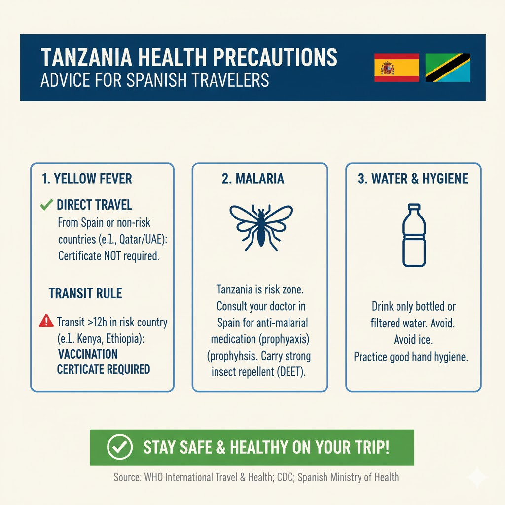 - Malaria: Tanzania is a malaria-risk zone. Consult your doctor in Spain about anti-malarial medication (prophylaxis) and carry high-strength insect repellent (DEET).