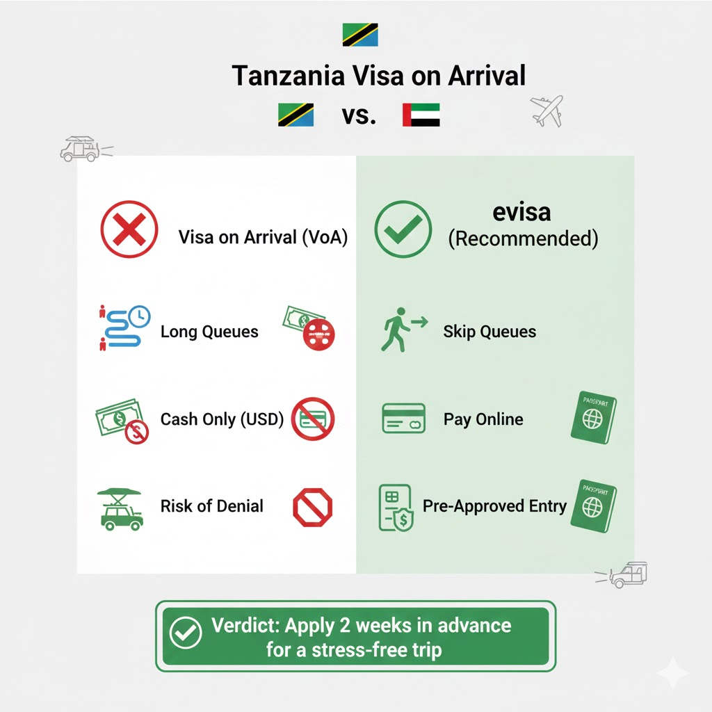 You can get a Visa on Arrival (VoA) at major entry points like Julius Nyerere International Airport (DAR) or Kilimanjaro International Airport (JRO). However, consider the downsides: