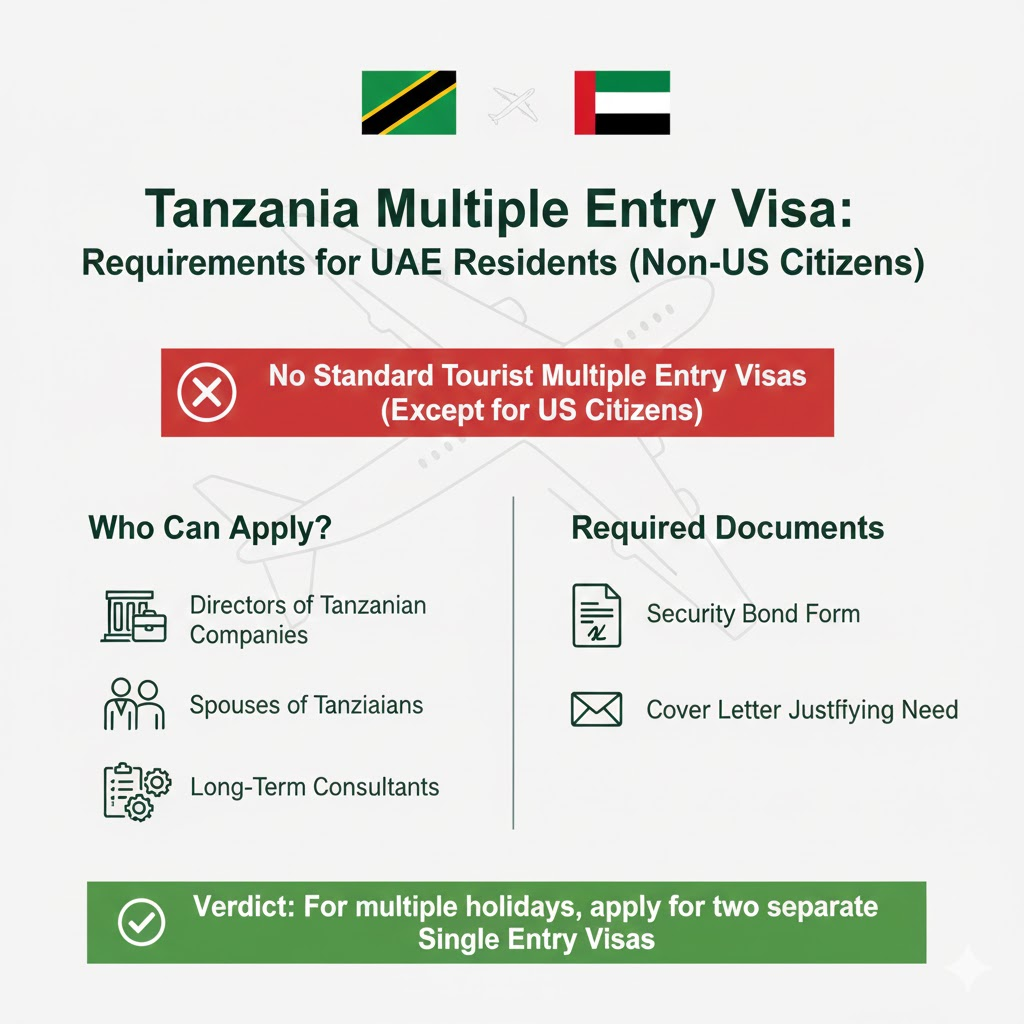 This is a common point of confusion. Unlike many other countries, Tanzania does not issue Multiple Entry Visas to standard tourists (unless you are a USA citizen, who is mandated to get one).