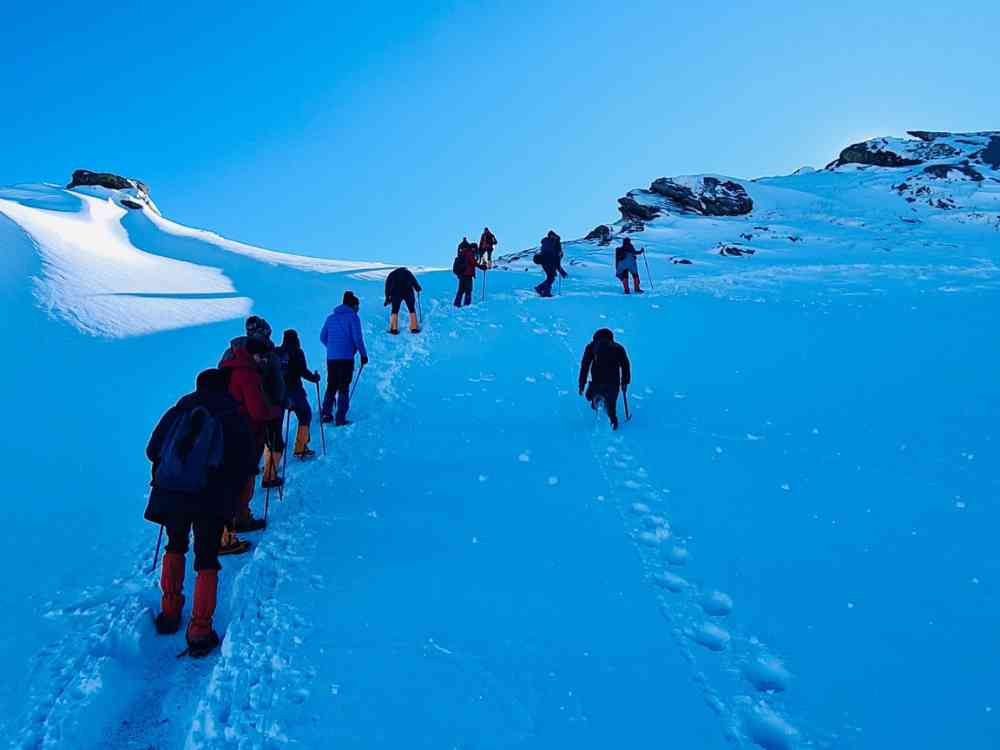 By March, snowfall begins to taper off at lower elevations, but higher camps and the summit often retain thick snow patches, especially in shaded areas. Trekkers in March enjoy both snow trekking and milder temperatures, though the pure, unbroken snowy vistas slowly give way to the first signs of spring.