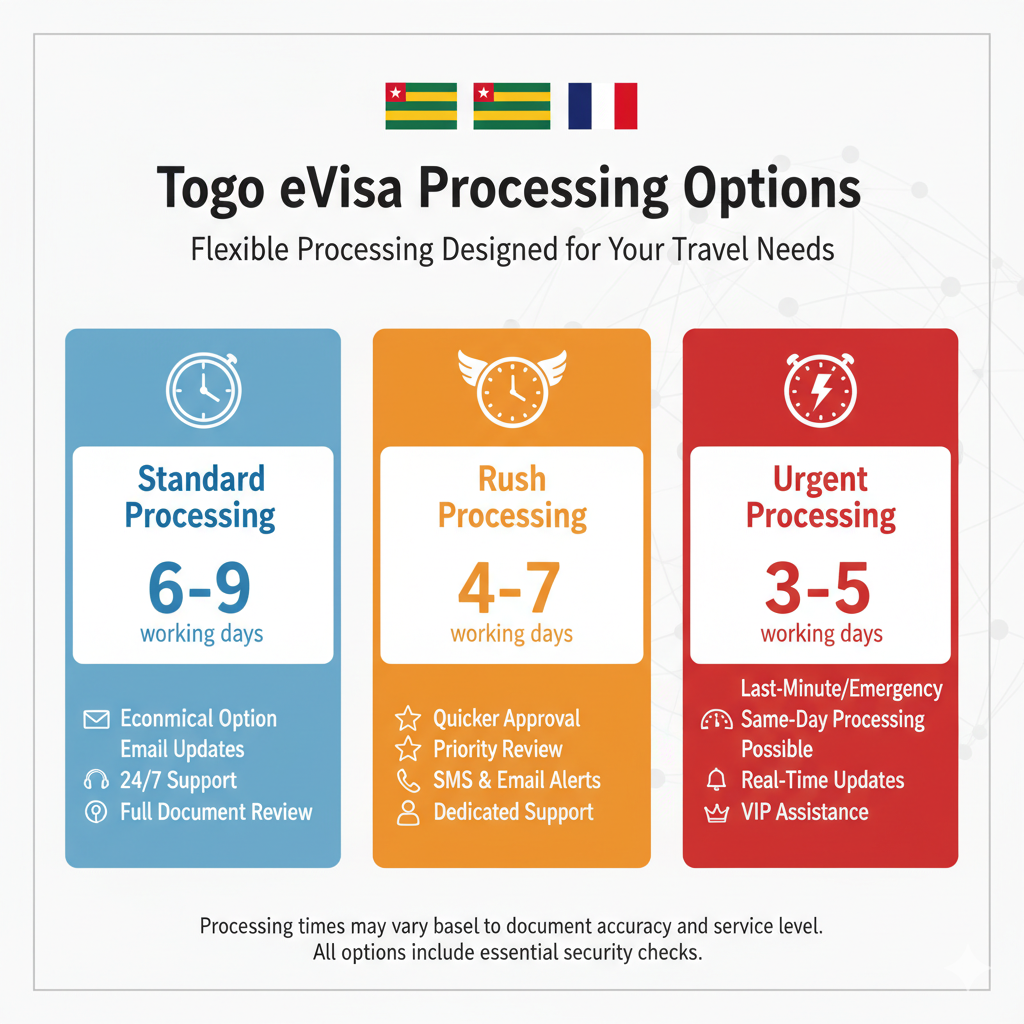 The Togo eVisa for France offers flexible processing options designed to meet different travel needs. While processing times are generally efficient, they may vary depending on the accuracy of submitted documents and the chosen service level.