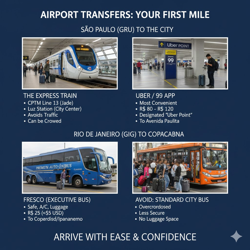 - The Express Train: The CPTM Line 13 (Jade) connects the airport to Luz Station in central São Paulo. It is cheap (~R$ 5.00) and avoids traffic, but it requires a transfer and can be crowded with luggage.