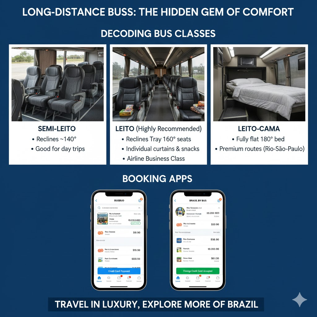 - Leito-Cama: Fully flat 180° bed. Available on premium routes like Rio-São Paulo.