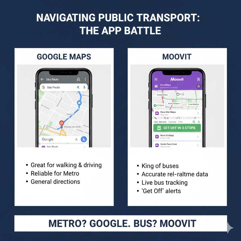 - Moovit: The king of buses in Brazil. It has much more accurate real-time data for local bus schedules, arrival times, and "get off" alerts than Google Maps. If you are taking a bus, download Moovit.