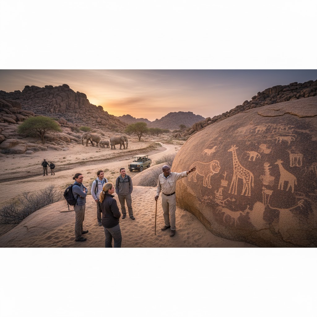 Your destination is Twyfelfontein, a UNESCO World Heritage Site with one of the largest concentrations of ancient rock engravings in Africa. Check into your lodge (many are spectacularly built into the boulders) and enjoy the profound silence.