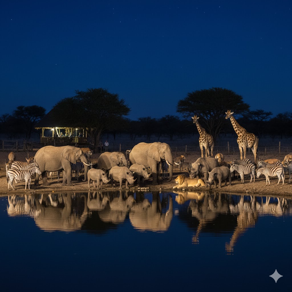 In the evening, grab a drink and sit at the Okaukuejo waterhole. It's not uncommon to see 10+ elephants, rhinos, and lions all drinking at the same time. Itââ¬â¢s like watching a live-action nature documentary.