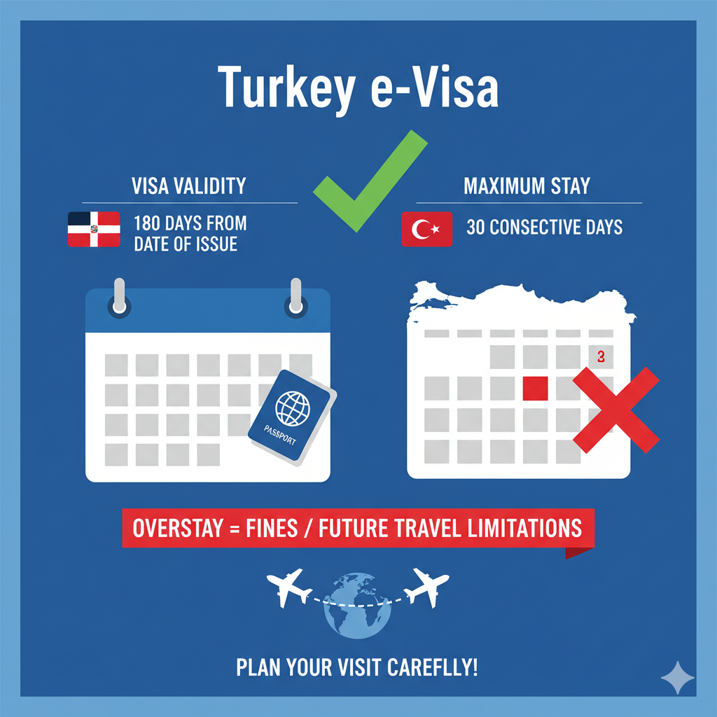 Turkey e-Visas for Dominican RP citizens last 180 days after the issuing date.