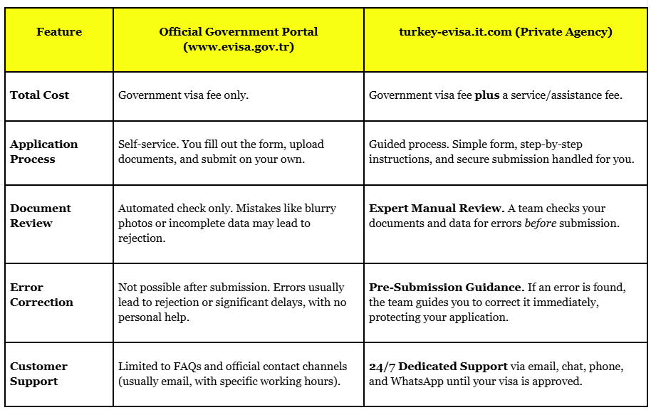 Applying for an e-Visa through the official Turkish government portal is the cheapest option, but it is a self-service process. Using a private agency like turkey-evisa.it.com offers added peace of mind, expert review, and dedicated support for a service fee.