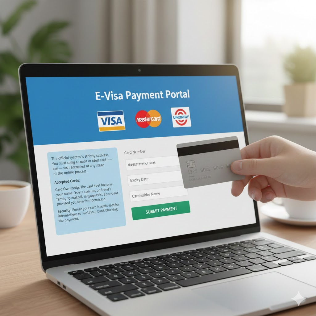 The official system is strictly cashless. You must pay using a credit or debit card—cash is not accepted at any stage of the online process.
