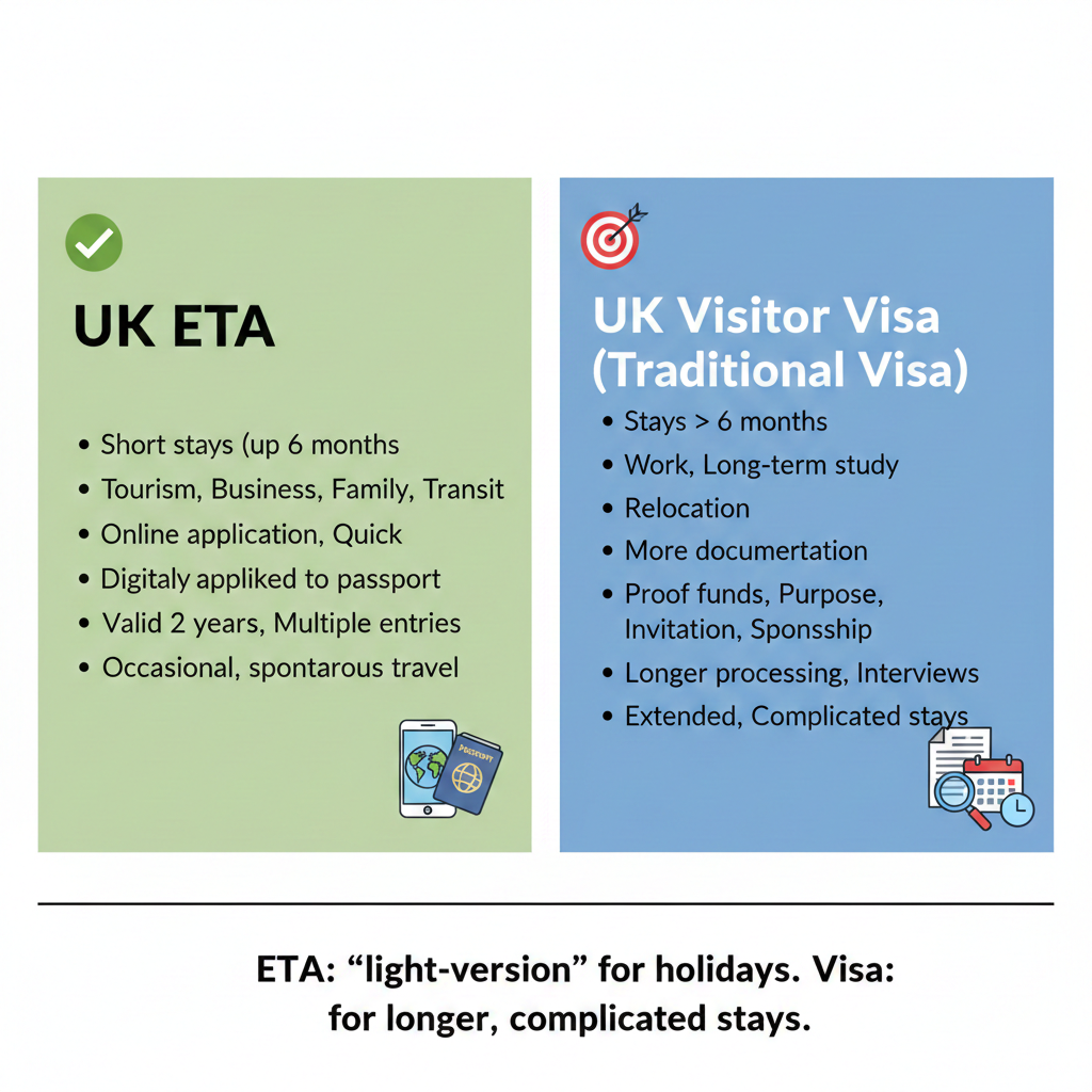So: think of ETA as a “light‑version” of travel permission — quick, easy, and perfect for holidays or short trips. A traditional visa remains the right option for longer, more complicated stays.