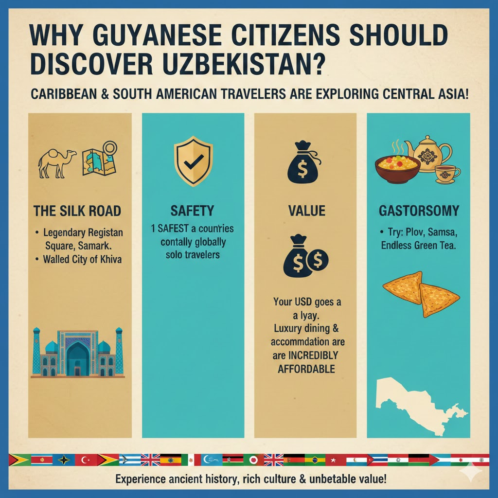 Are you a citizen of Guyana looking to trade the rainforests of the Amazon for the ancient desert cities of the Silk Road? Uzbekistan is rapidly becoming a top destination for adventurous travelers, and for Guyanese citizens, visiting has never been easier.
