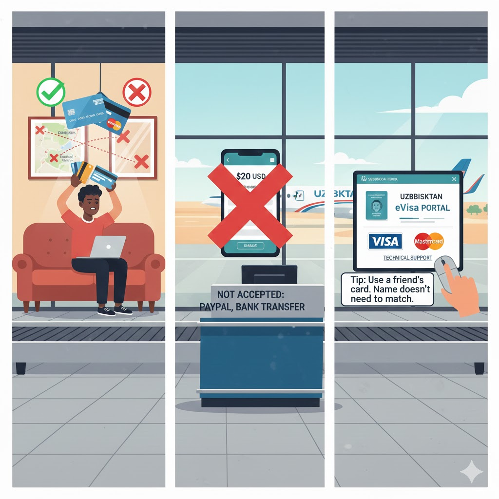 The payment step is where most users face issues. The Uzbekistan eVisa is strict about the payment methods: