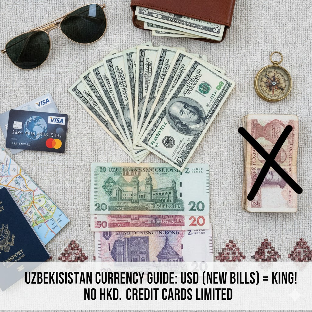 Do not bring Hong Kong Dollars (HKD) to Uzbekistan. They are virtually impossible to exchange.