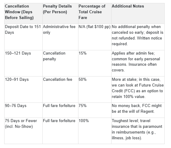 Regent implements a tiered penalty system especially in cases of trips longer than 15 days, especially when dealing with the premium suite packages such as SG-H. The cancellation policy is described below: