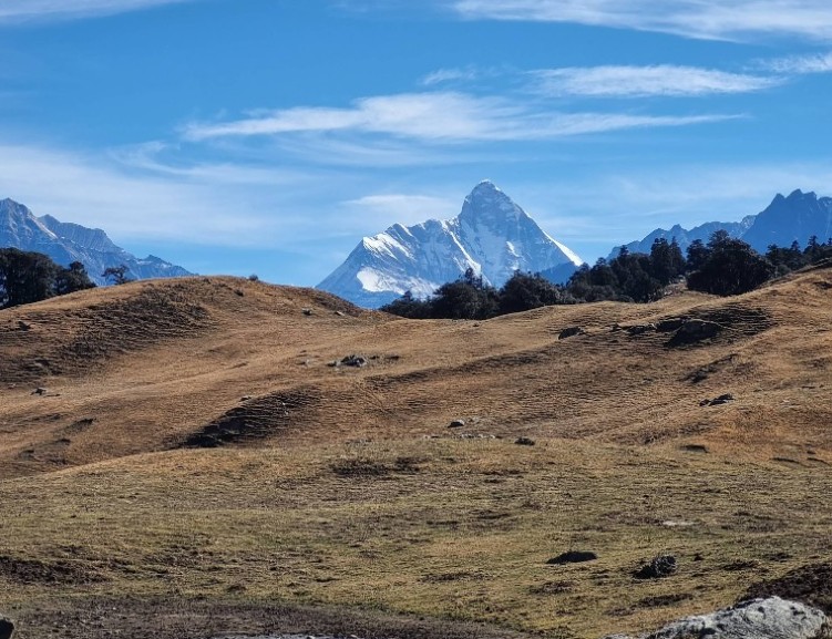 One of the biggest highlights of the Brahmatal Trek is the uninterrupted view of Mount Trishul and Nanda Ghunti, two of the most admired peaks in Uttarakhand. As you gain altitude, these peaks start appearing more clearly, standing tall against the bright winter sky. The way Trishul glows during sunrise is one of the most memorable moments of the entire trek. Nanda Ghunti, known for its sharp ridge and elegant shape, adds a dramatic element to the mountain skyline. By the time you reach the upper camps and summit ridge, the mountain views open wide, making it easy to capture stunning photographs. For many trekkers, these close Himalayan views are the main reason Brahmatal stands out from other winter routes.