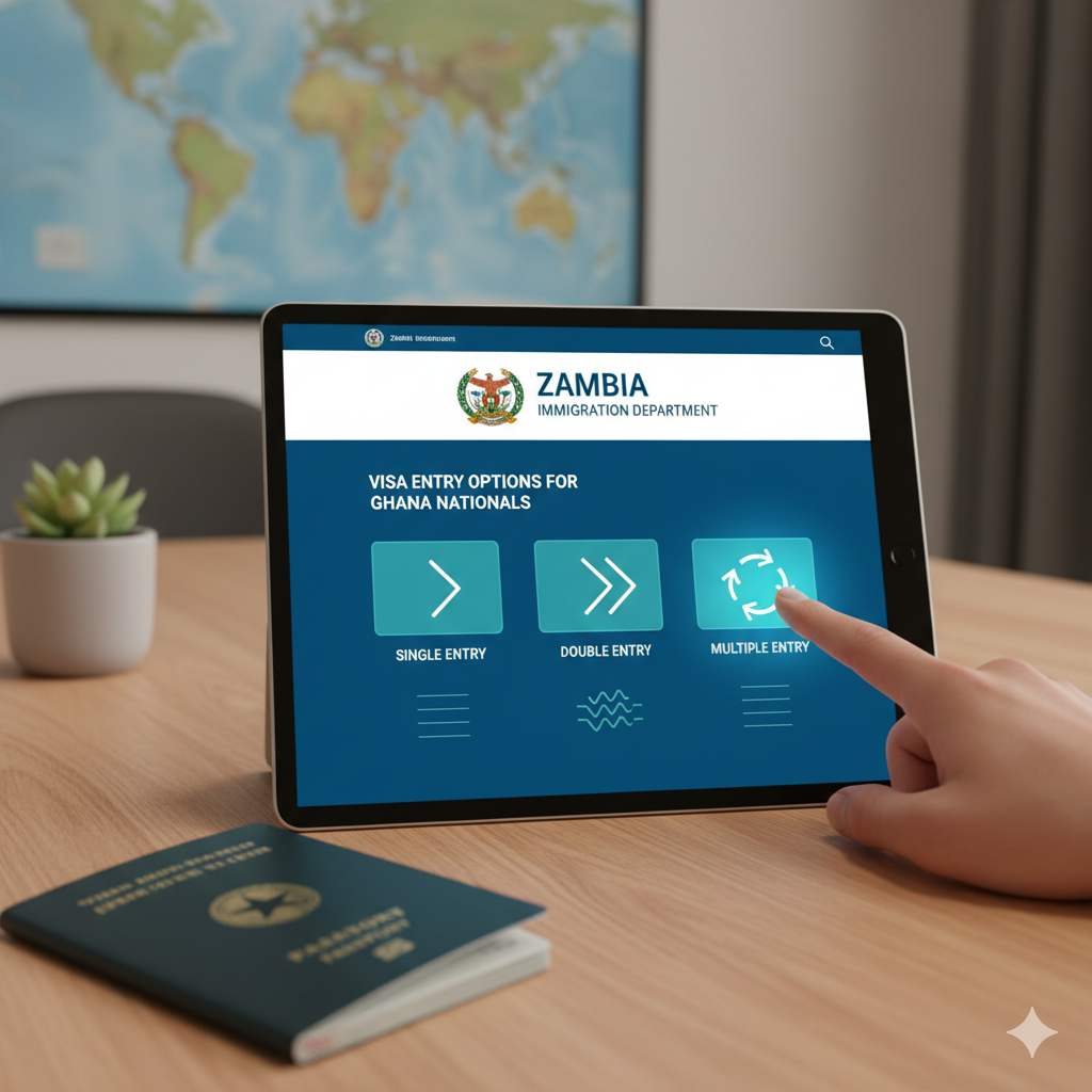 The Zambia eVisa system offers different entry-options: single, double (two entries), and multiple entries. For Ghanaian nationals, hereâs what the sources suggest: