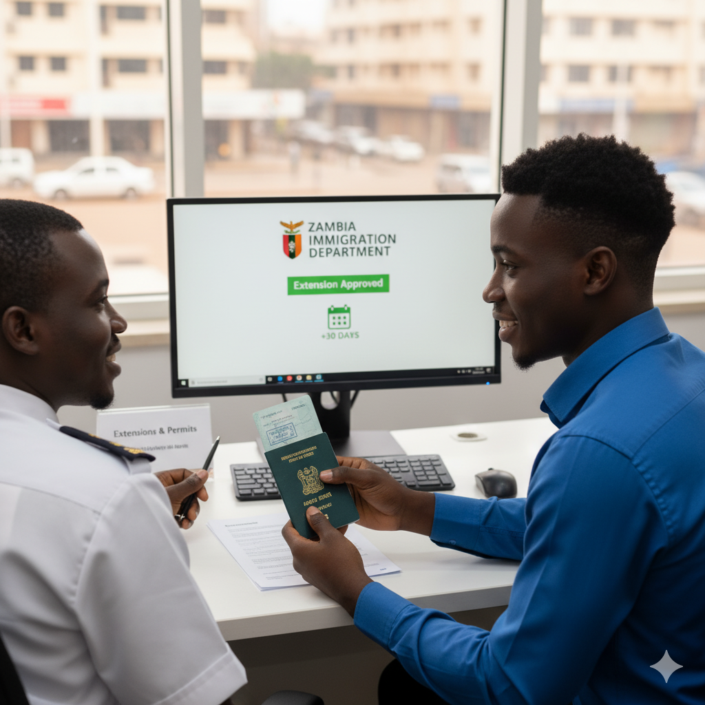 - Before your authorised stay expires (i.e., before the date stamp or approval letter date runs out), go to a Zambia Department of Immigration office (for example in Lusaka).